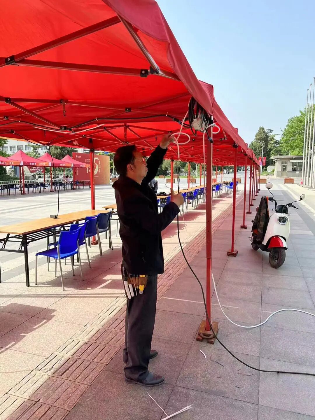 5月3日,中心接到校友办举行“家·年华”校友返校日的用电需求。面对施工时间紧、任务重的严峻挑战,电管科立即派出供电保障小组,携带300余米电缆和多个临时配电箱赶赴电气安装现场。仅仅用了半天时间,就配合校友办在邱德拔体育馆北广场为24个校友接待棚安装了临时电源箱,为校友接待提供了安全可靠的用电保障。